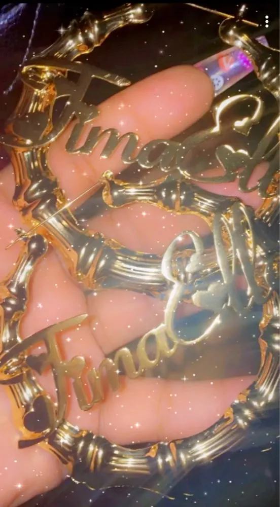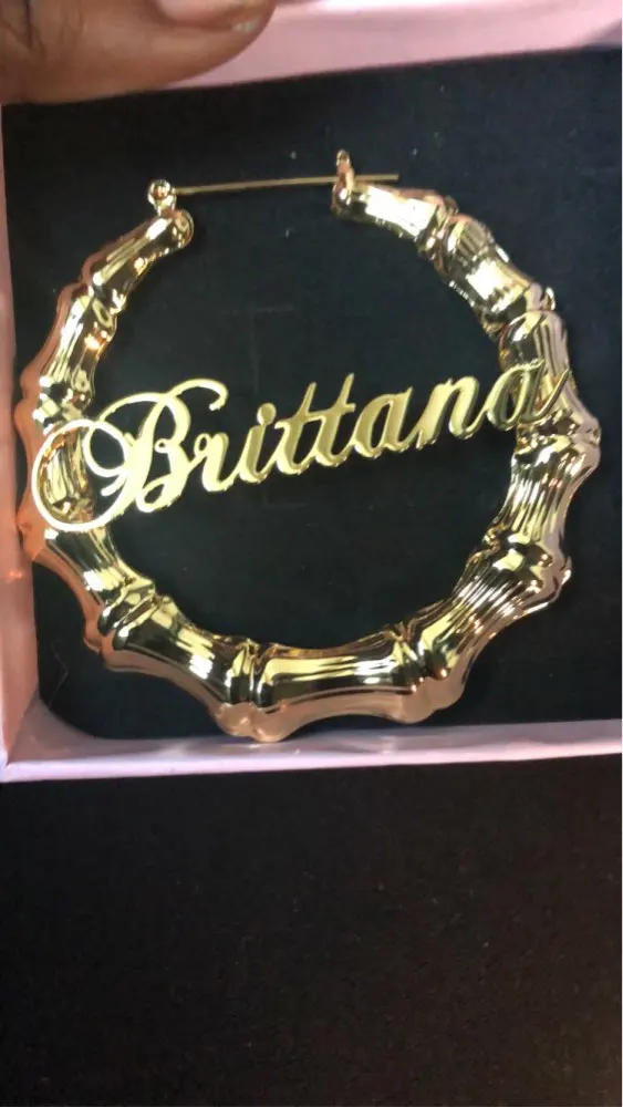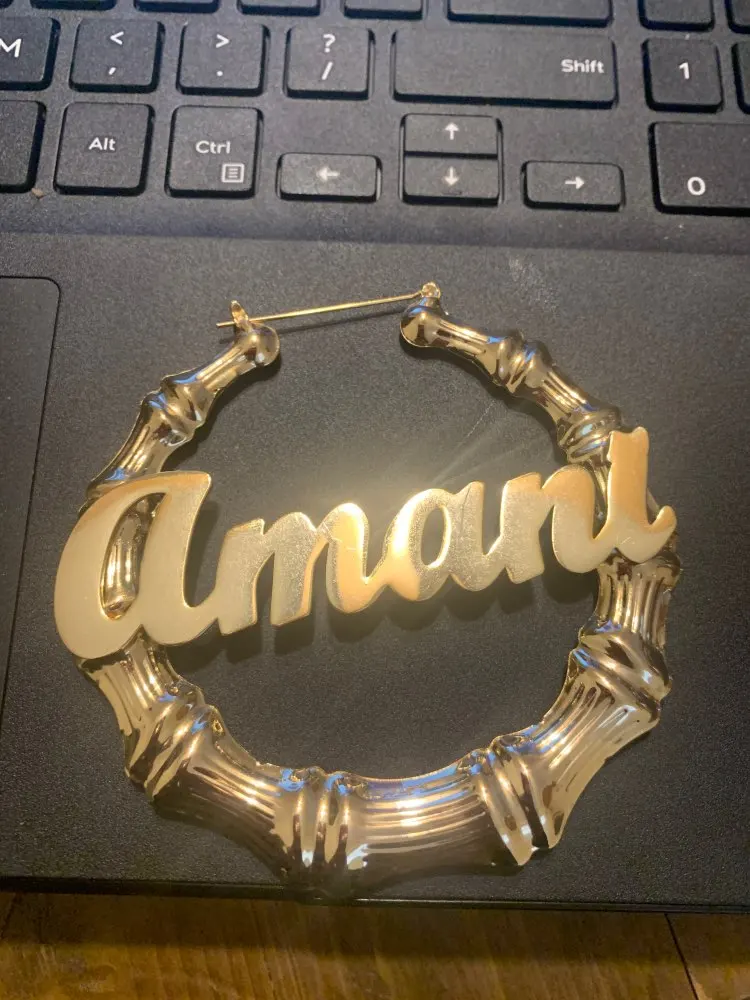 This stunning design features a pair of large hoops shaped earring that surrounds the name of your choice in any script font. Made of natural eco-friendly bamboo and plated in gold, silver or rose. With up to 16 letters to include, personalize these hoop earrings with your name, child name, inspirational words.